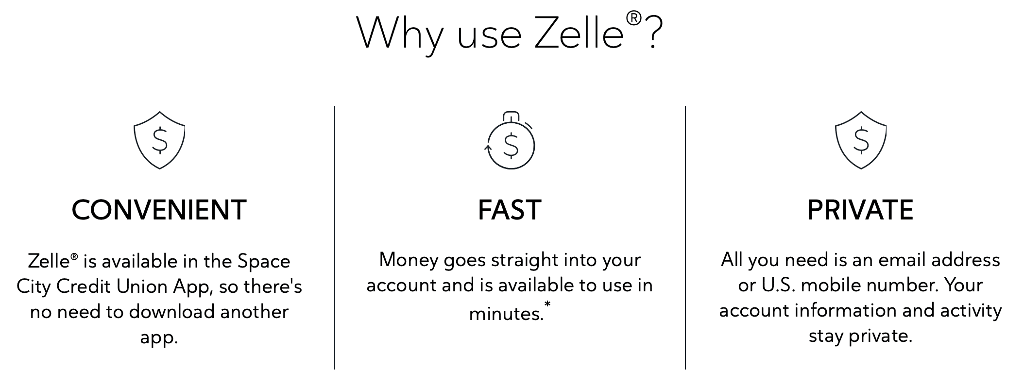 Keeping your money and information secure is a top priority for Space City CU. When you use Zelle® within our mobile app or online banking, your information is protected with the same technology we use to keep your Space City CU account safe.
